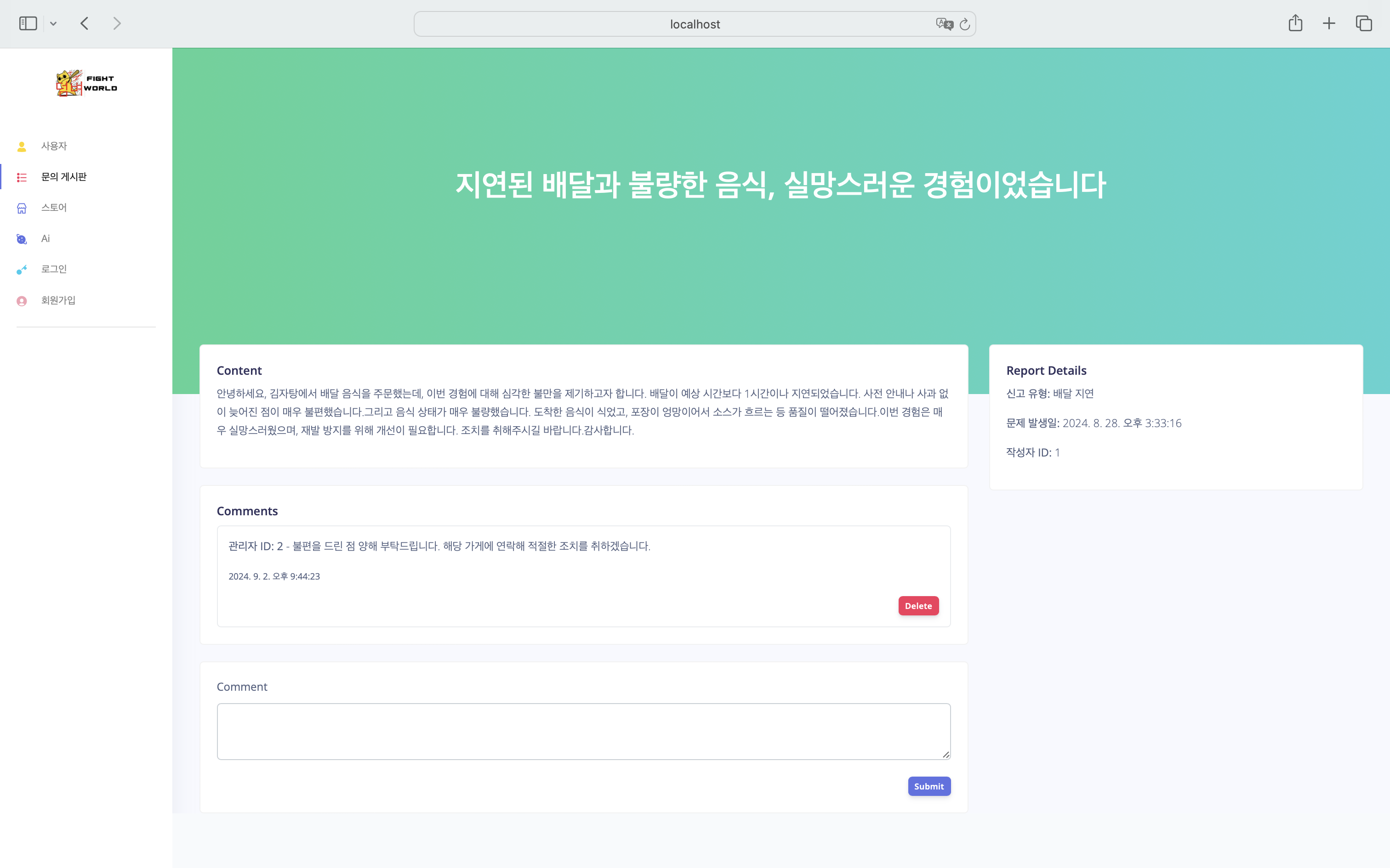또한 관리자는 밑에 있는 댓글 작성 칸에서 새로운 댓글을 작성할 수 있으며, 작성한 댓글 옆에 삭제