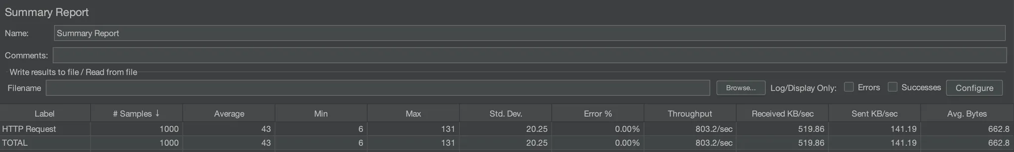 성능: 평균 응답 시간이 43ms, 최대 응답 시간은 131ms로, 모든 요청이 200ms 이내에