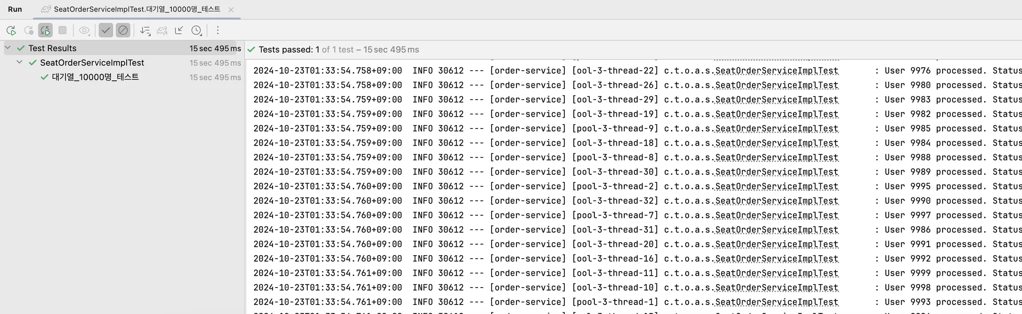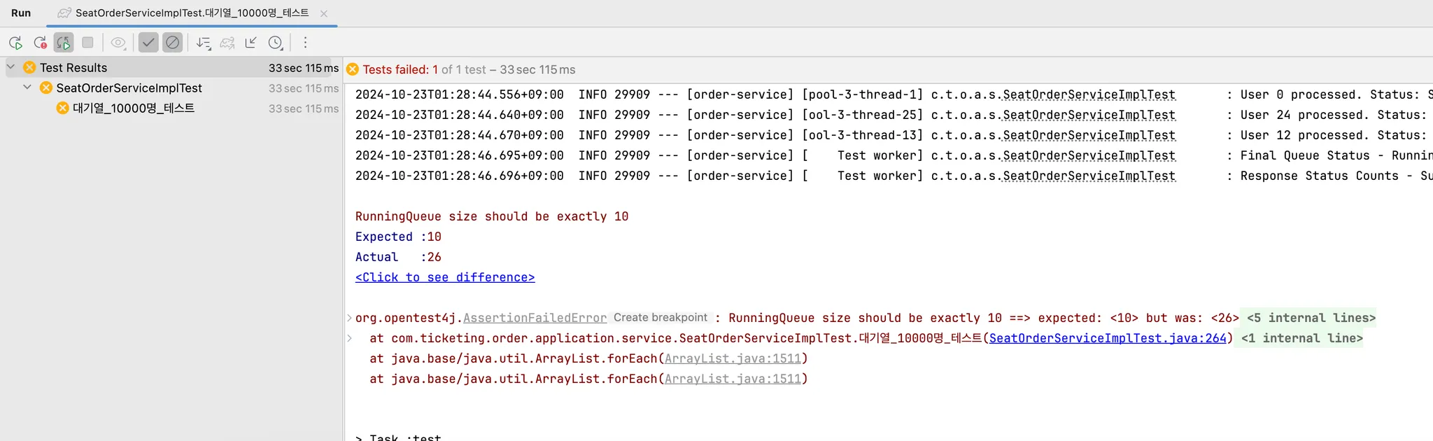 대기열 - 대규모 동시 접속(10000명) 테스트에서 Running Queue의 최대 용량이 10명으로